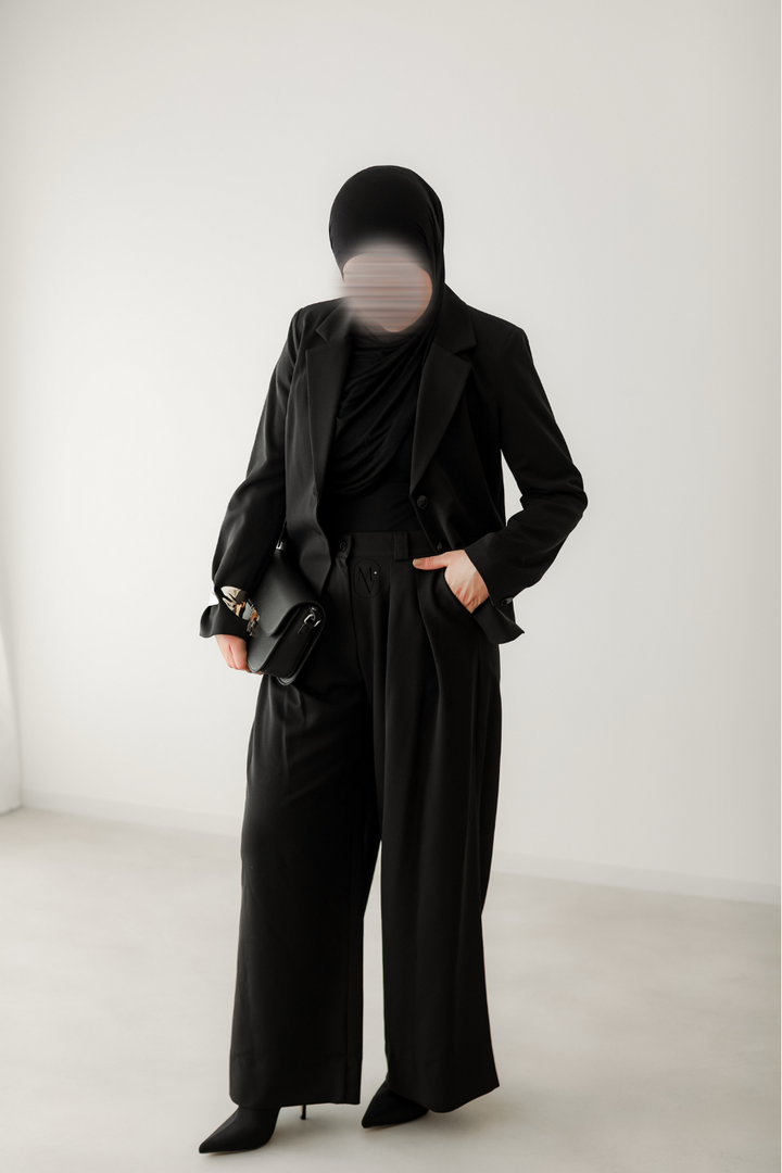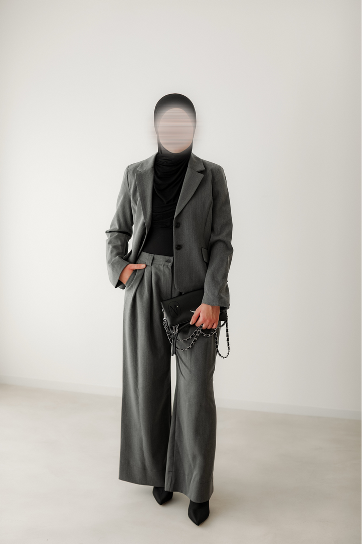 structurée apportent une touche de raffinement, tandis que le pantalon large et fluide