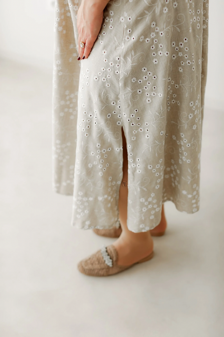 ensemble en beige doux, délicatement brodé de motifs floraux. Confectionné dans un
