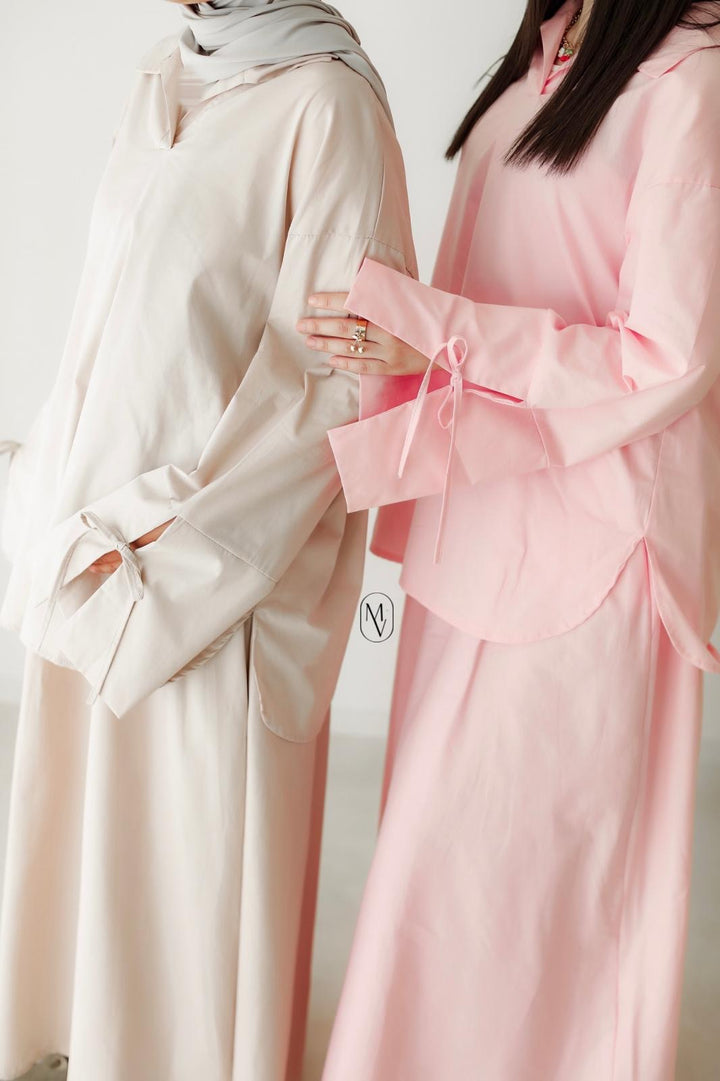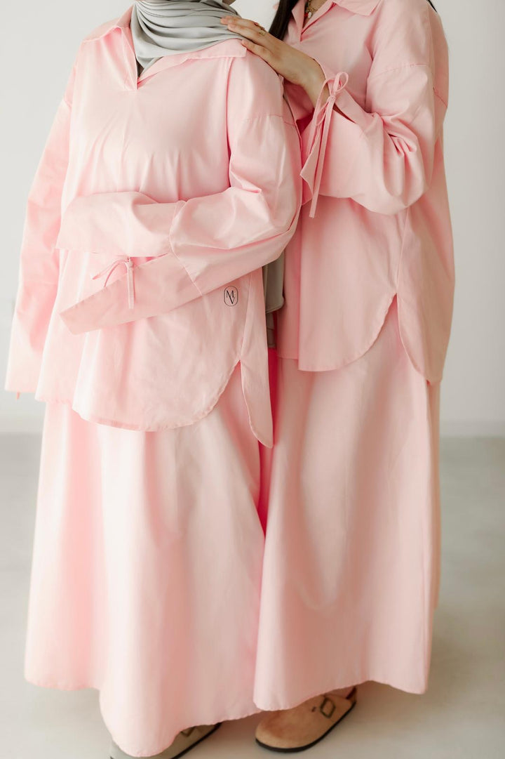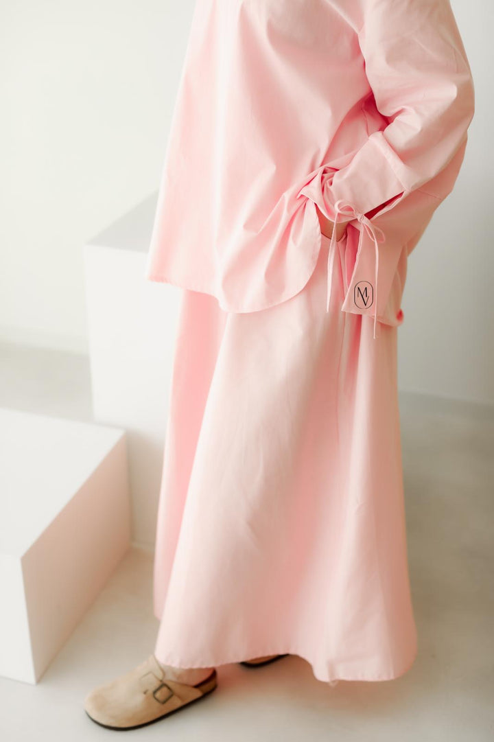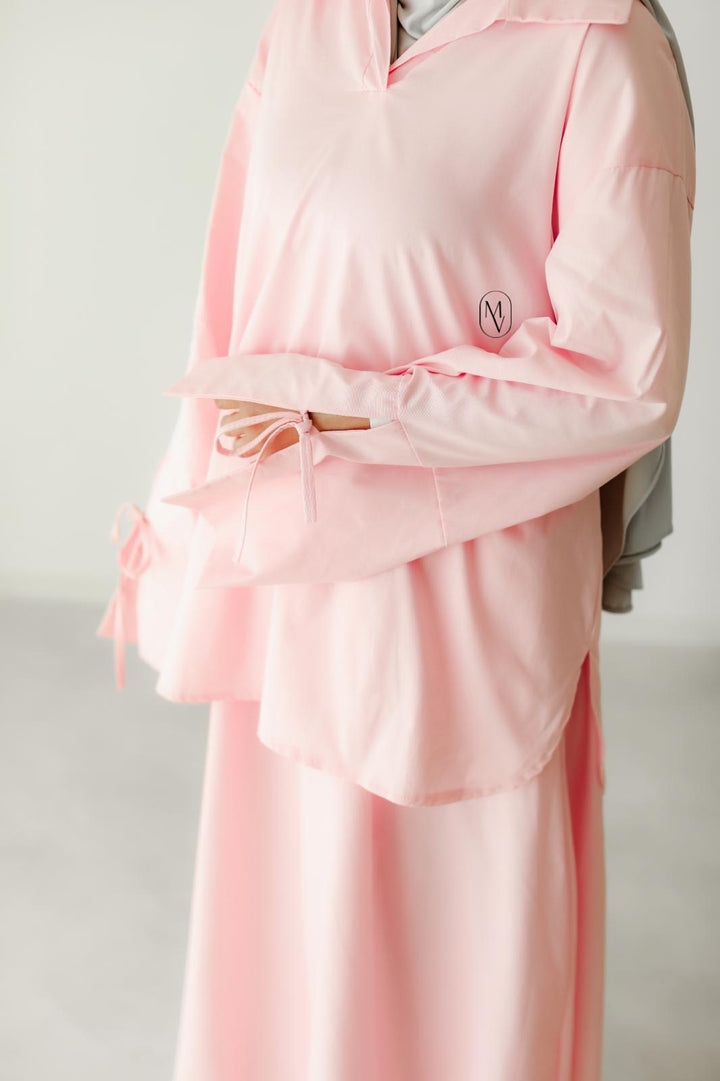 Adoptez une allure fluide et apaisante avec notre ensemble MIRAE, composé d’une tunique à col chemise et manches longues, associée à une jupe ballon fluide et légère. Sa teinte rose pastel évoque la tendresse et la fraîcheur printanière.