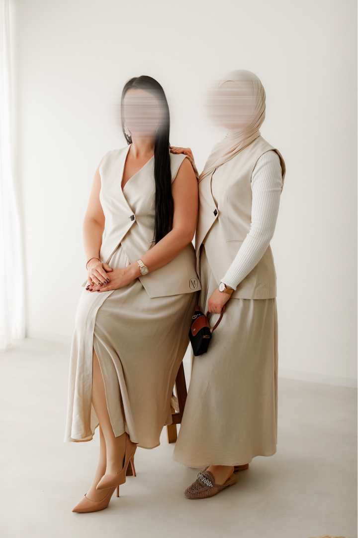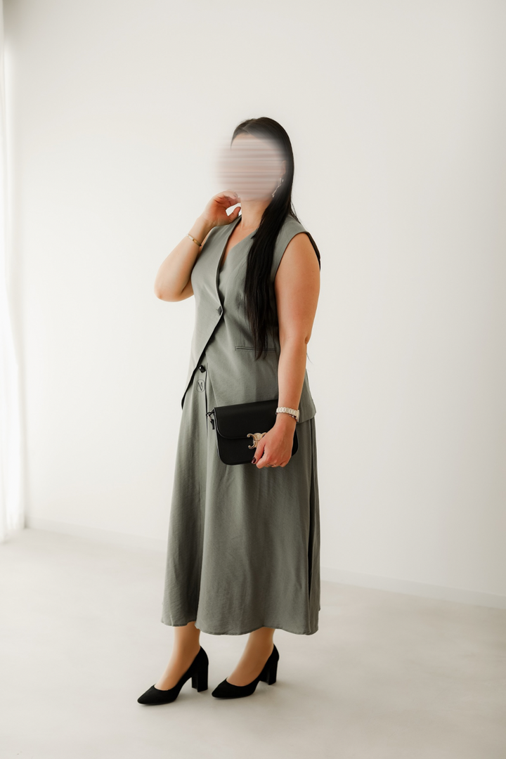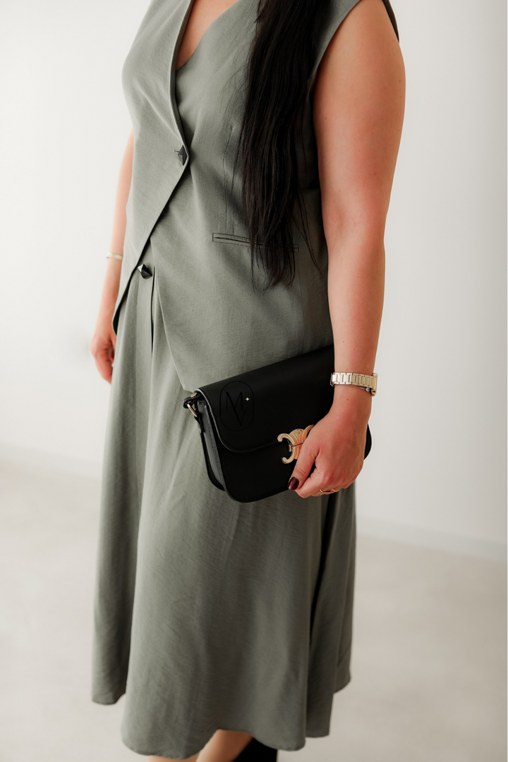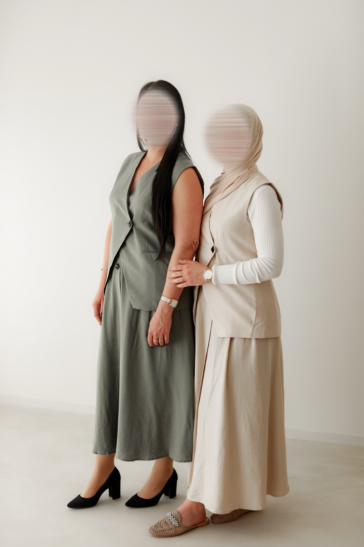 pour une allure à la fois sobre et élégante. Proposé en beige, vert et noir, cet ensemble