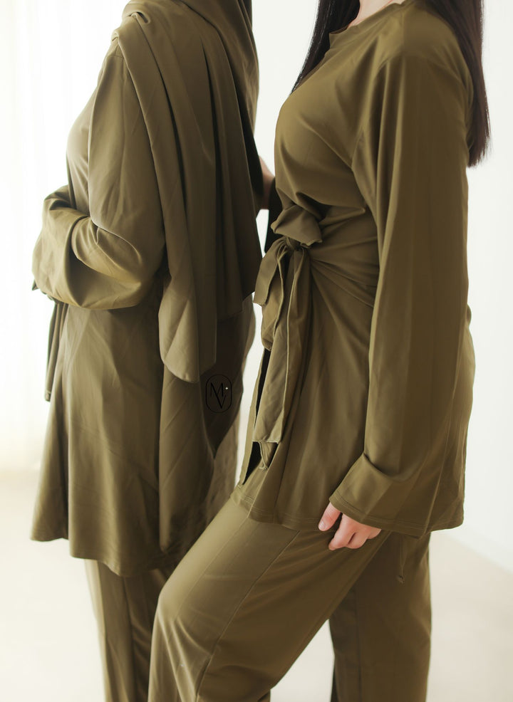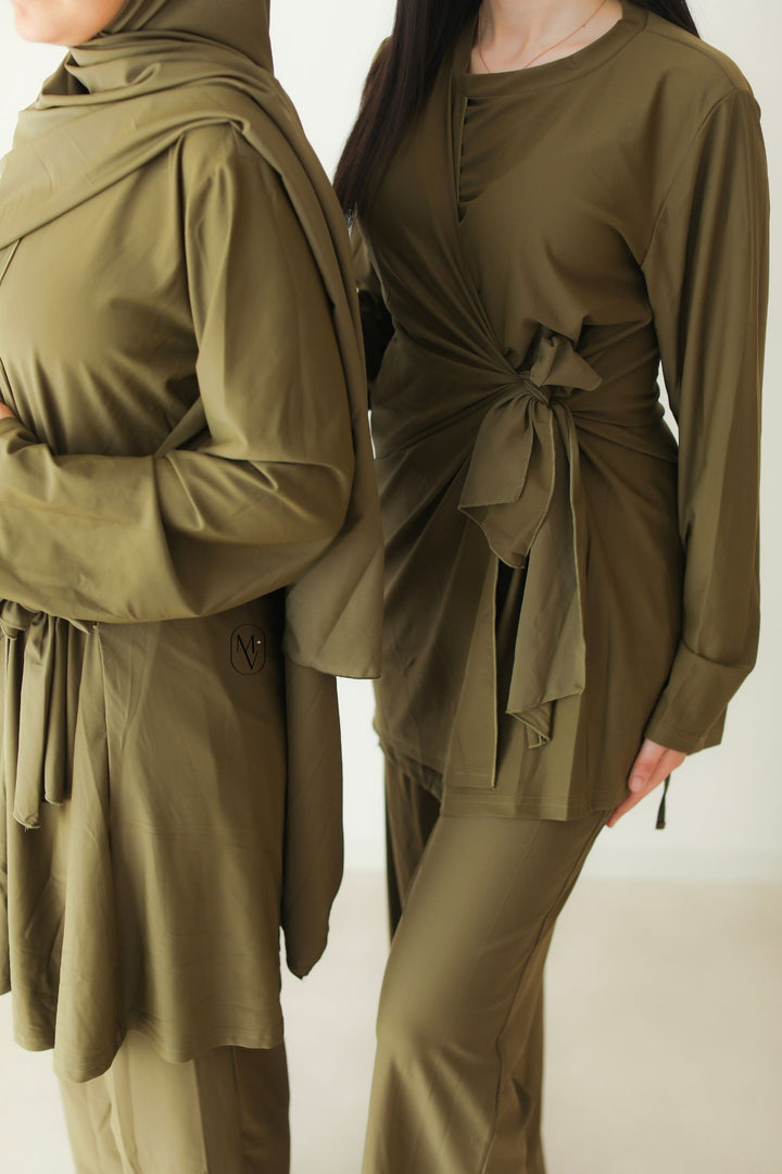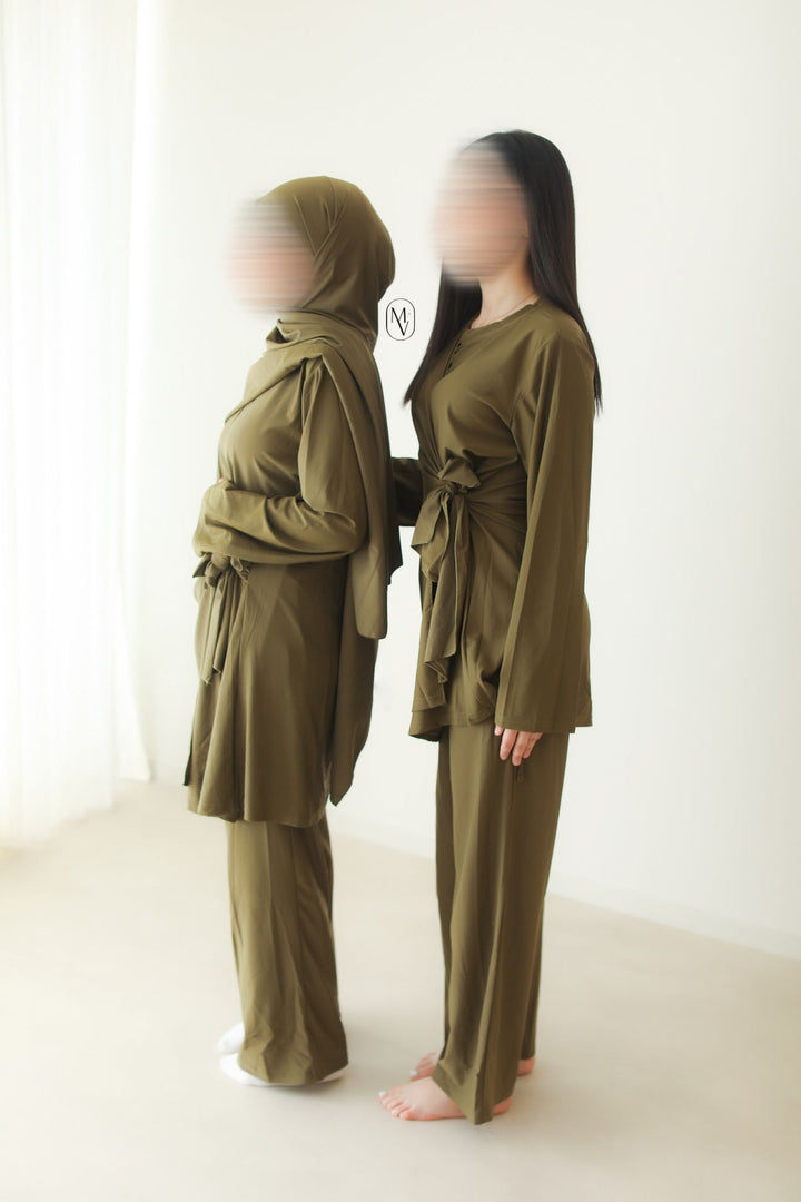 Le haut, à manches longues, se noue élégamment à la taille. Le pantalon droit assure une allure sobre et pratique, idéal pour la plage ou la piscine. Ce modèle est décliné dans un ton kaki, qui s’adapte à toutes les carnations et garde une allure raffinée en toutes circonstances.